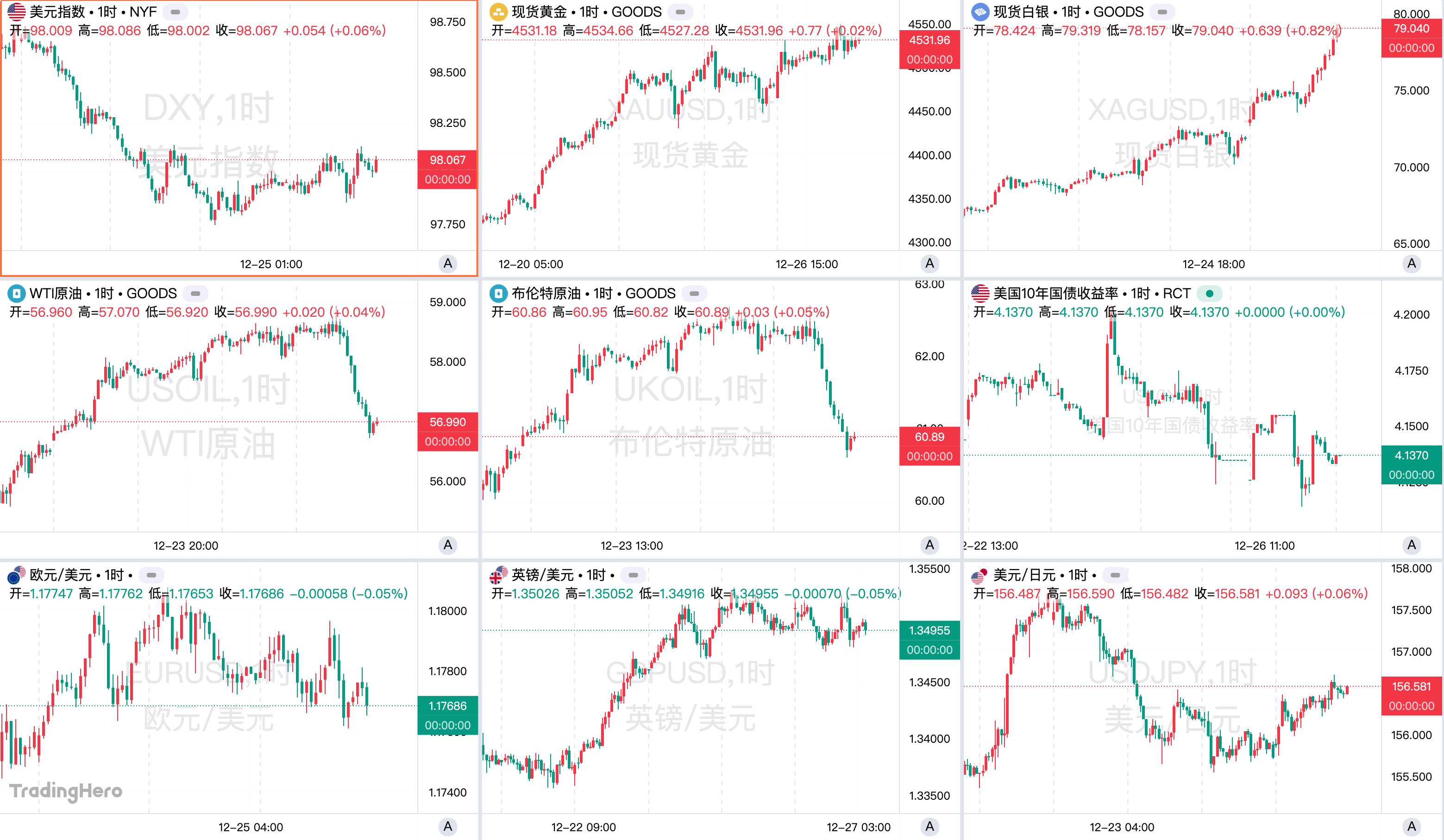 本周,美元指数整体偏弱运行,周五收于98.07,下跌0.67%。周一开盘后持续下行,周二进一步跌破98关口,反映市场对美联储明年降息预期有所升温,之后虽然出现技术性反弹,一度重回98附近,但力度有限,全周仍处相对低位震荡。